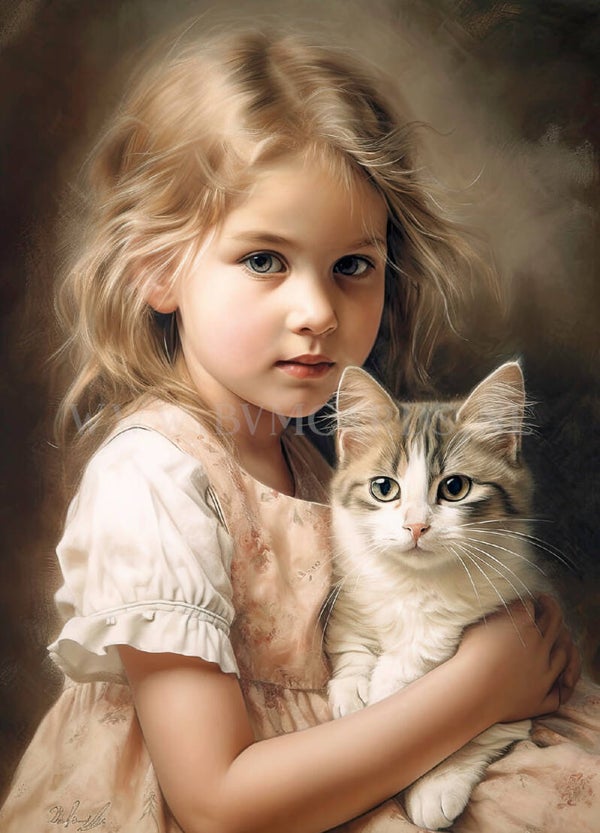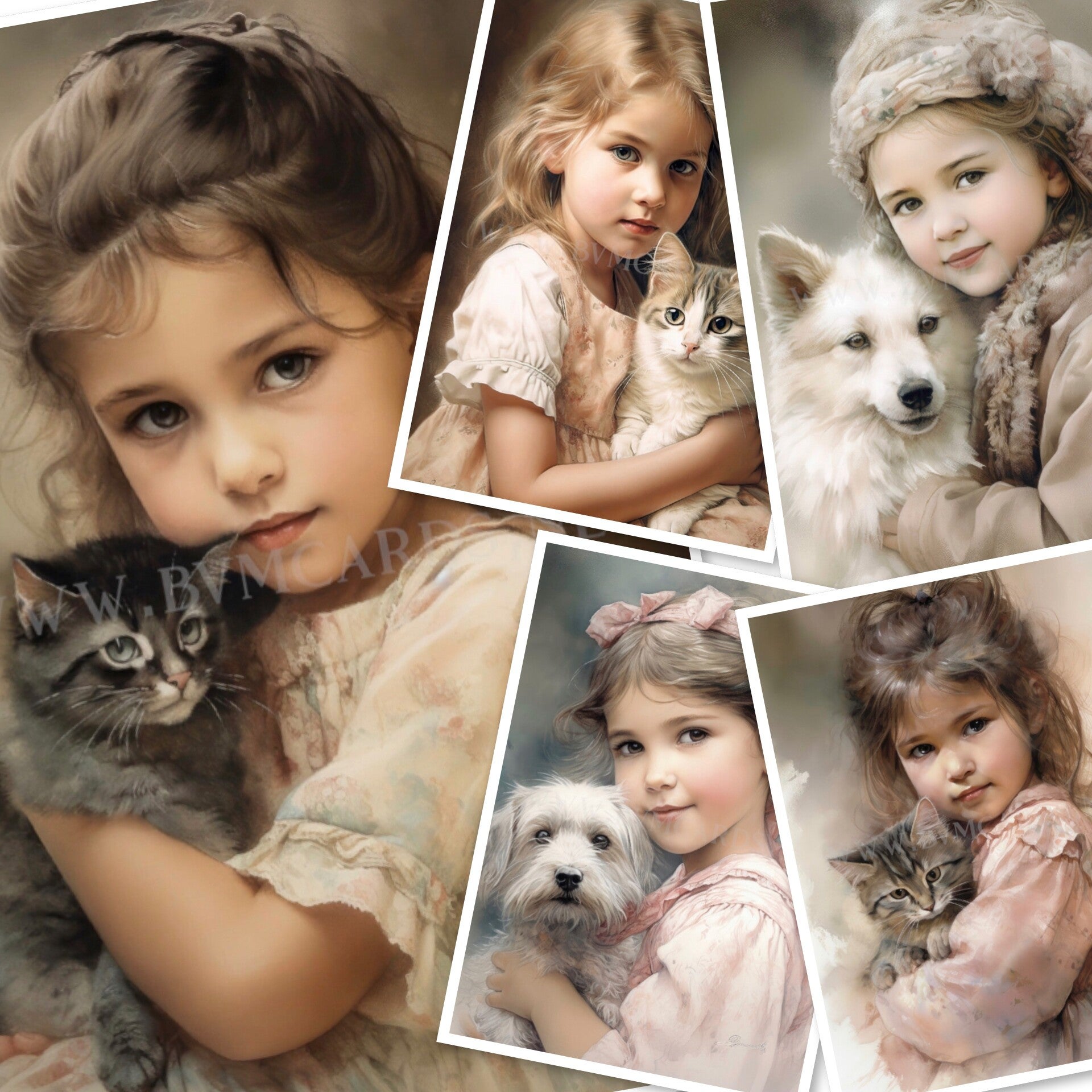 Set ansichtkaarten 10 stuks (5 verschillende soorten). Blanco - Meisje met hond/poes. En een beschrijfbare 'postcard' achterzijde. Formaat 10x15 cm.