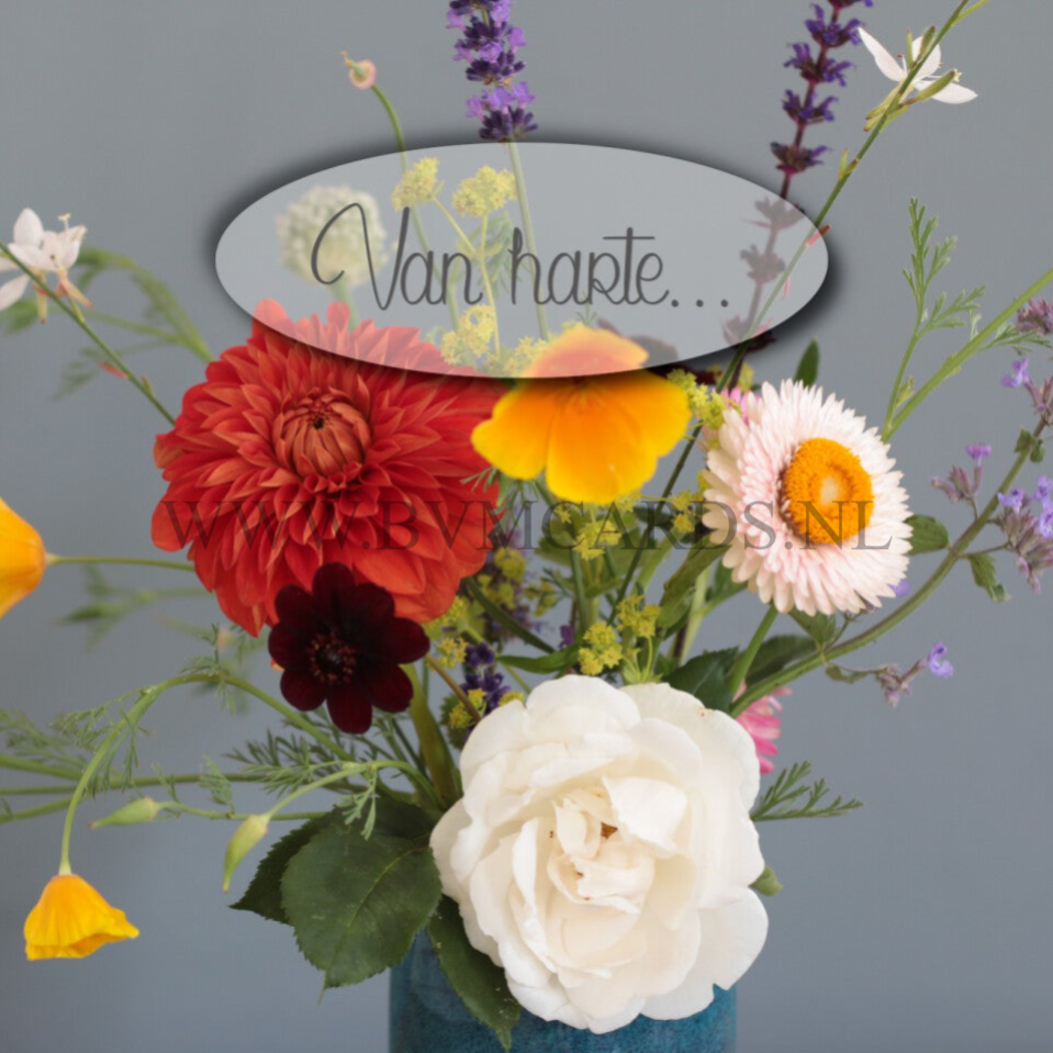 Dubbele kaart | Van harte | Bloemen | Formaat 11x11 | inclusief bruine envelop.
